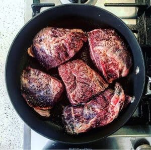 Season beef cheeks and sear in dutch oven with 1 tbsp oil on medium to high heat - approx 4 mins or until golden brown. Remove and leave on clean plate