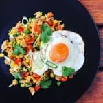 Once everything is combined and heated remove from heat and add 1 raw egg and stir it in to rice. Squeeze lime on top and sprinkle with coriander.