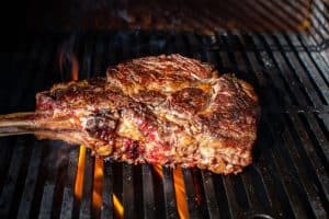 Cook your steak for approx. 40 minutes (turning half way) on indirect heat until the internal temperature is 45c (for medium rare), remove steak from the BBQ, cover gently with foil and allow to rest for 15 minutes. Meanwhile add more coal to the BBQ or turn up the gas BBQ so that it is at 300c