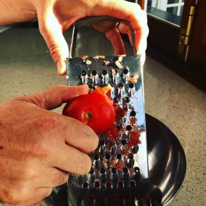 Grate tomatoes on largest side of box grater into bowl - as you grate you will get the pulp in the bowl and be left with the skin to discard.