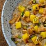 Serve with sprinkled pistachios, toasted coconut and mango on top.